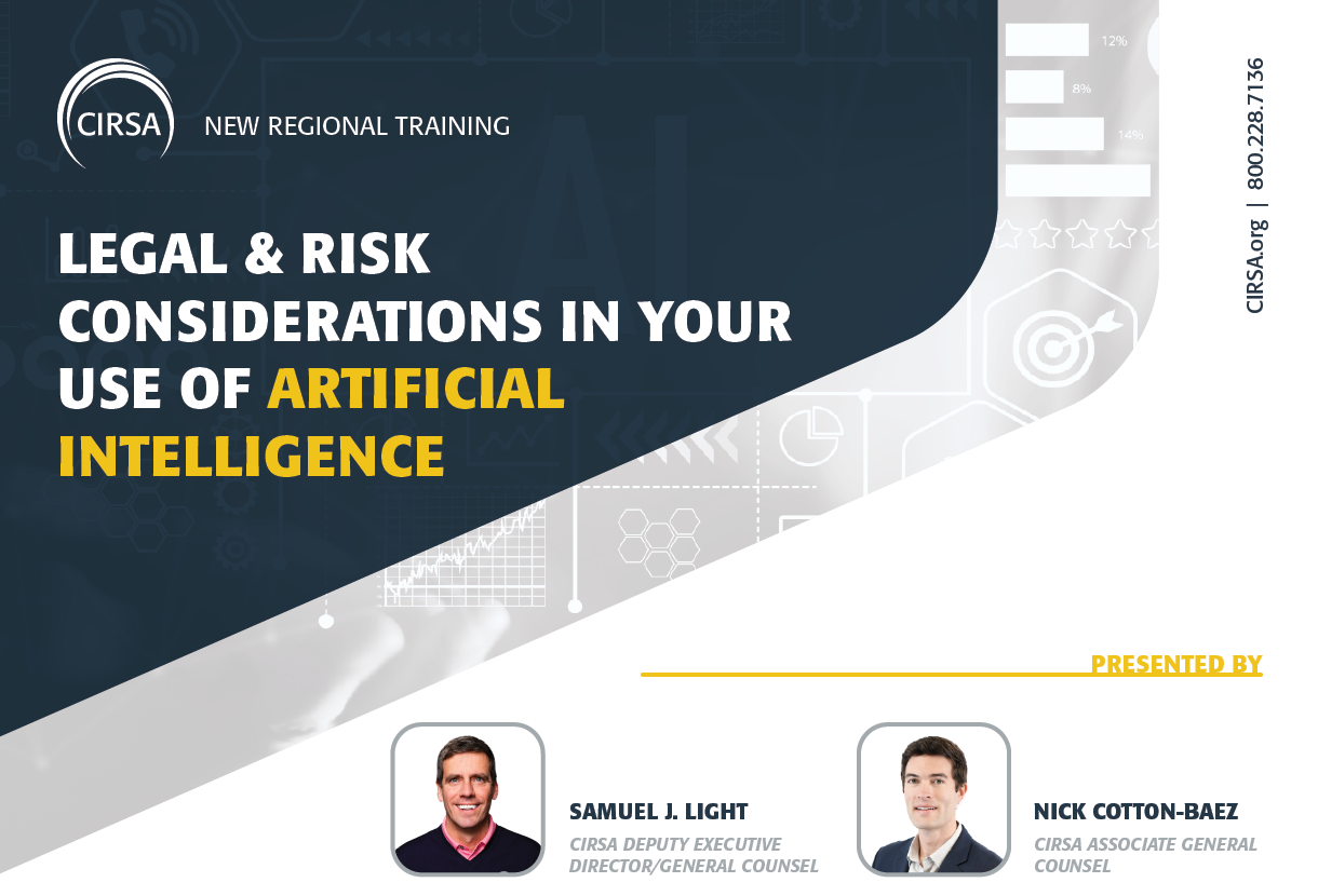 At the same time, AI raises new questions about employee and organizational accountability, copyright infringement, data privacy, cybersecurity, bias, and transparency, and introduces other new risks—probably even some that only AI could help us identify! Therefore, it’s important to understand both the opportunities and risks associated with AI. In this seminar for CIRSA members, we’ll explore the fast-growing role of AI in local government, highlight key legal and risk management issues, and offer practical guidance that can help you and your organization embrace the benefits of AI technologies while reducing your liability exposure and ensuring public trust.